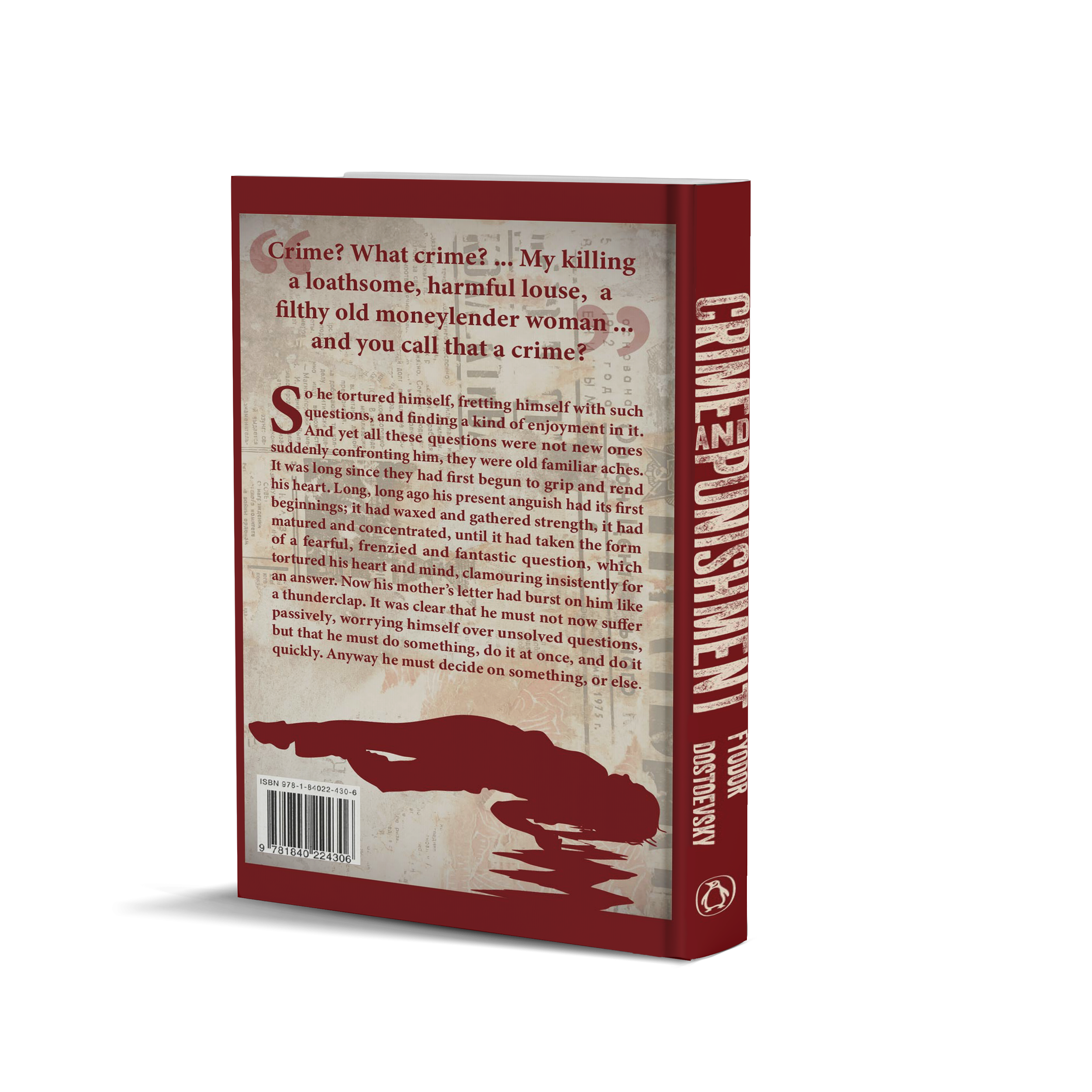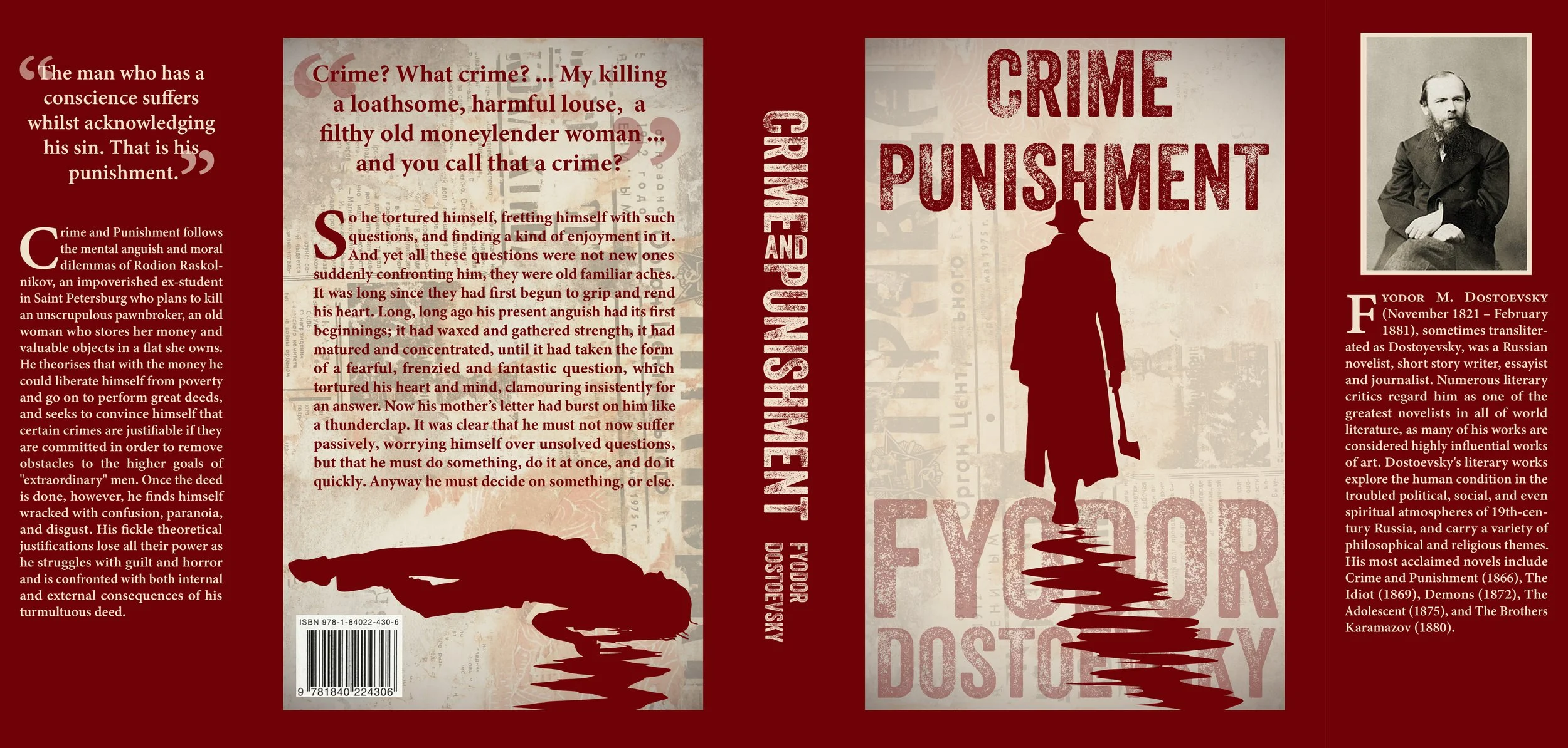 I read Crime & Punishment during the summer of 2024 and was instantly fascinated by the writing style of Dostoevsky. The way he dives so deeply into the psyches of his characters makes the reader exceptionally aware of the growth, or in this case, discomposure of the characters throughout the novel. I created this book jacket shortly after reading the novel to display my take on the iconic book. The jacket features classic distressed text, a blood-red color scheme, and a connection between the murderer and victim on the front and back cover.
