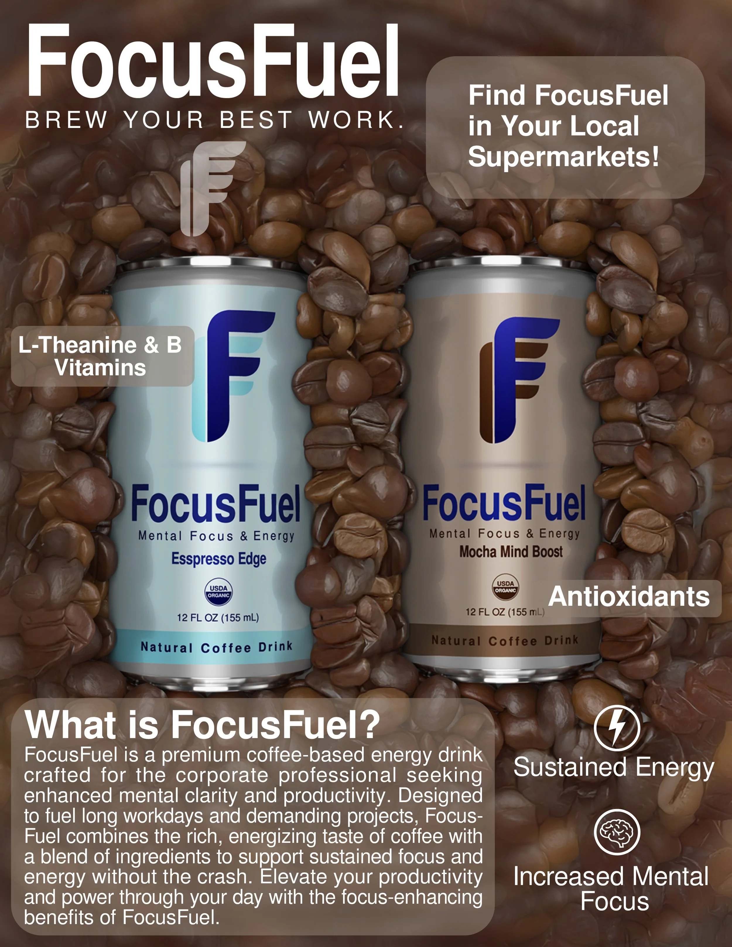 FocusFuel is a coffee-based energy drink crafted for the corporate professional seeking enhanced mental clarity and productivity. It is designed to fuel long workdays and demanding projects combining the rich taste of coffee with a blend of ingredients to support sustained focus and energy without the crash.